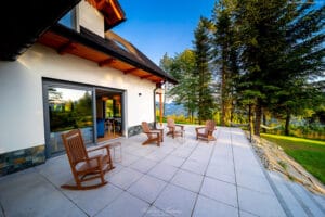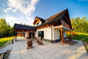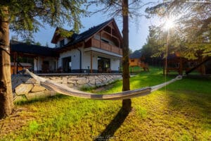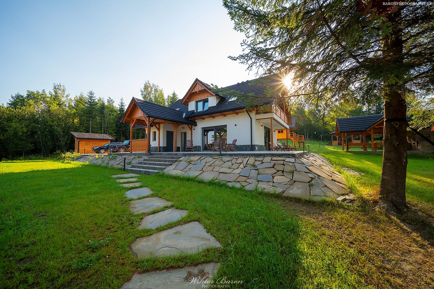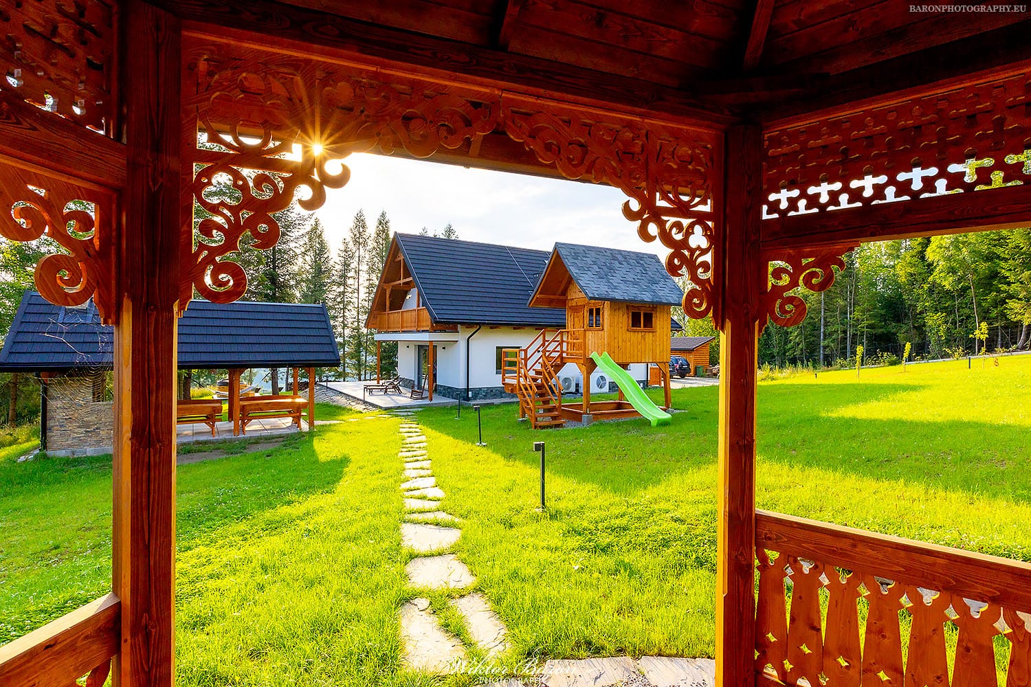 Nasz ogród to pół hektara ogrodzone solidnymi panelami. Dookoła nie ma innych domów tylko las i połoniny. Ta przestrzeń zapewnia całkowitą ciszę, spokój i prywatność. W ogrodzie znajdują się drewniany domek na palach do zabawy dla dzieci. Pod domkiem jest piaskownica, gdzie można się bawić nawet kiedy pada deszcz. Latem wystawiamy do ogrodu mały basen dla dzieci. Jest zadaszona przestrzeń grillowa z piecem do pizzy i tradycyjną kuchnią z fajerkami. Jest altana w pienińskim stylu, idealna do wspólnego spędzania czasu. W ogrodzie jest opalana drewnem bania. Jest też miejsce na duże ognisko z siedziskami dookoła. Nie zabrakło też kilku dwuosobowych hamaków rozwieszonych pomiędzy drzewami. Dodatkowo zbudowaliśmy w ogrodzie bulodrom do gry w pétanque. W naszym ogrodzie Wasze zwierzęta poczują się jak na wakacjach zaplanowanych również dla nich bo wybiegają się tak, że nie będzie im już potrzebny spacer po górach.